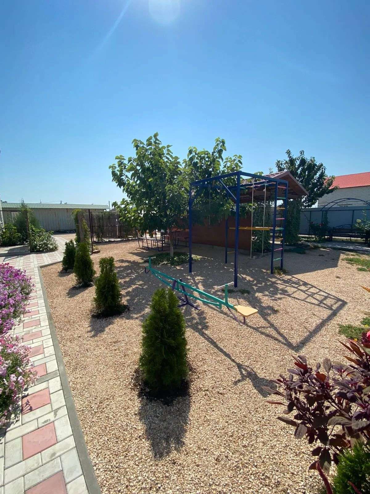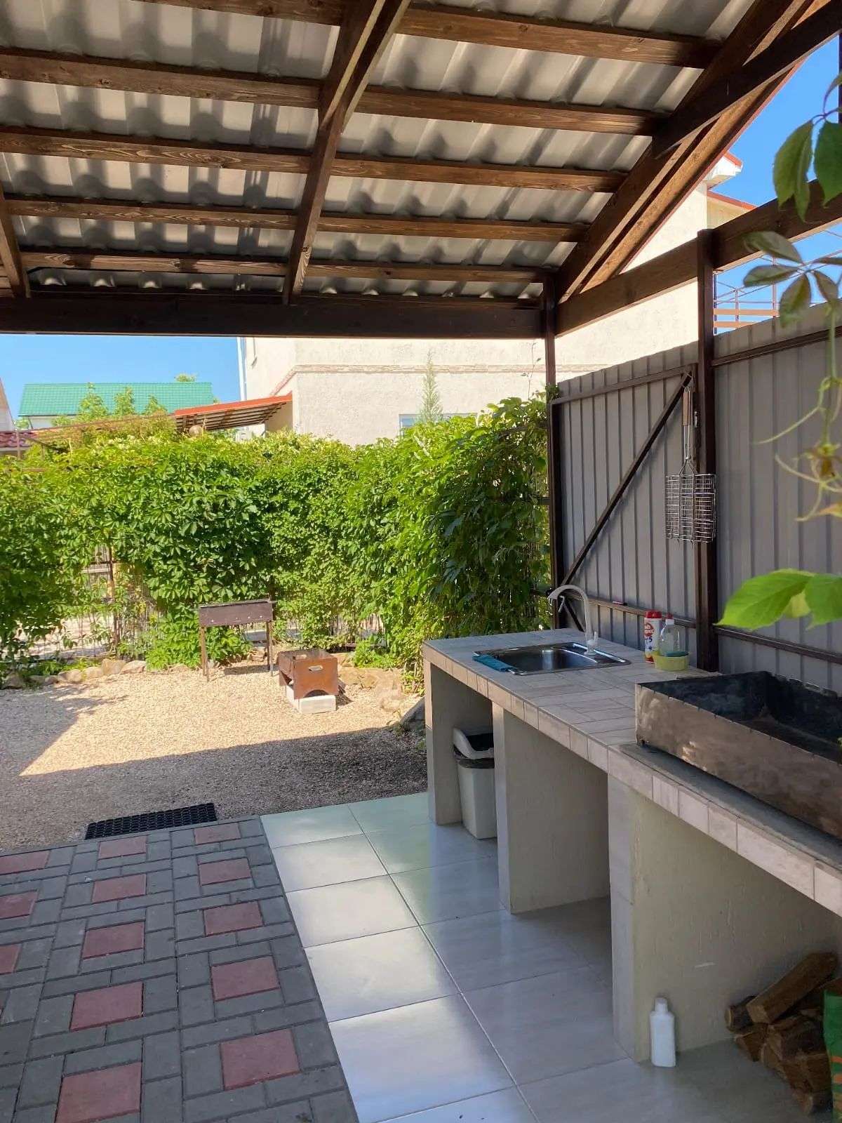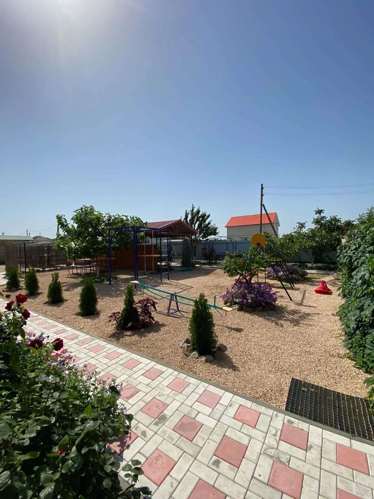 Просторный двор с общей мангальной зоной, детской площадкой и парковкой.