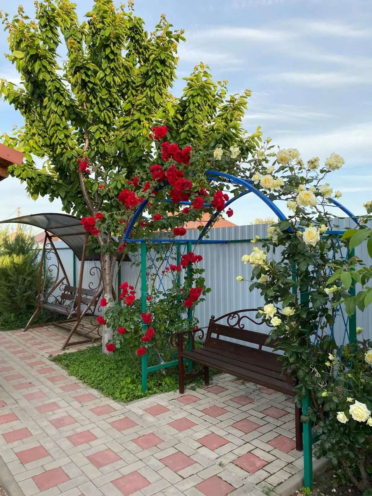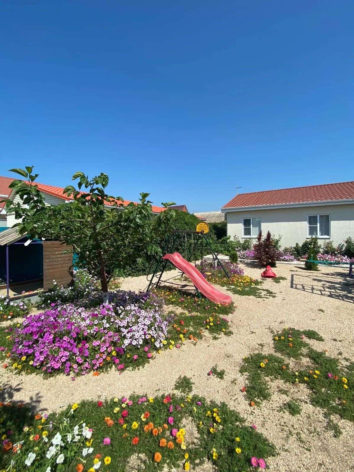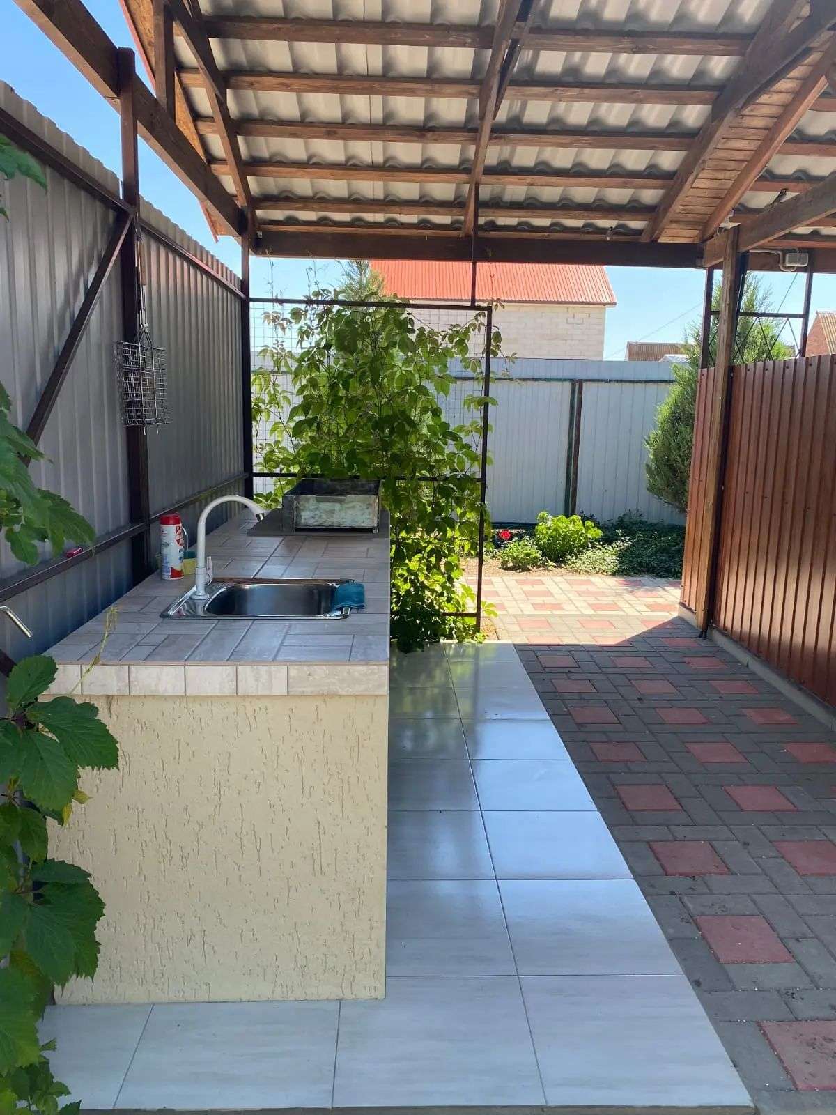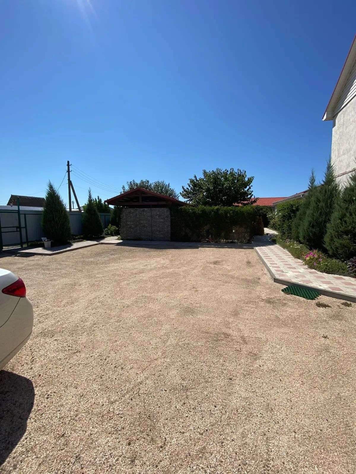 Просторный двор с общей мангальной зоной, детской площадкой и парковкой.
