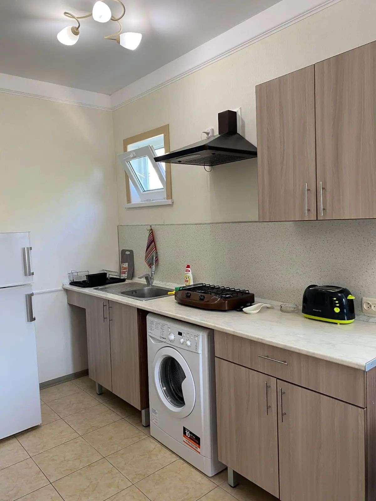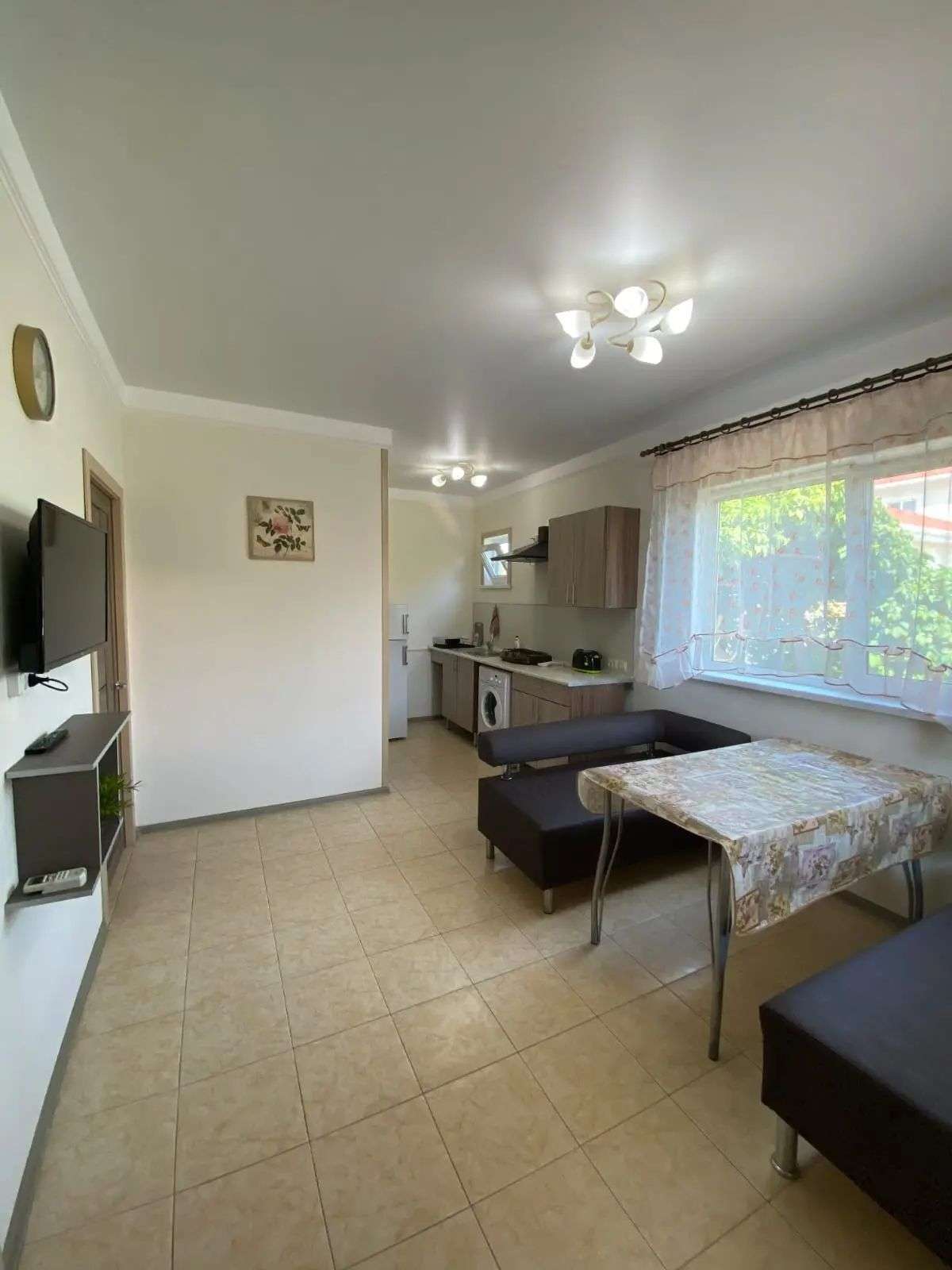 Площадь дома 64м2. В доме две изолированные спальни, кухня-гостиная, санузел с душем. Все удобства: телевизор, сплит-система, холодильник, стиральная машина, душ, туалет.