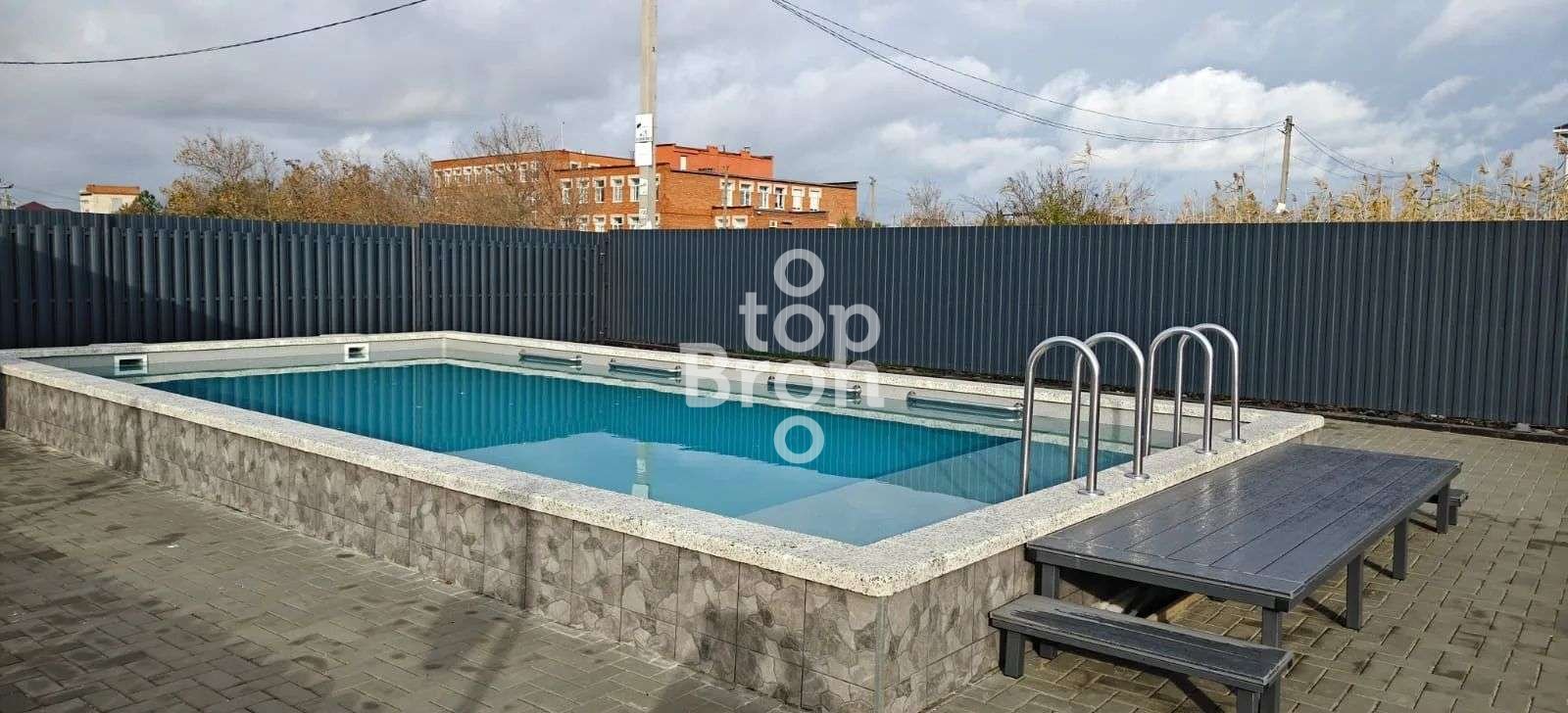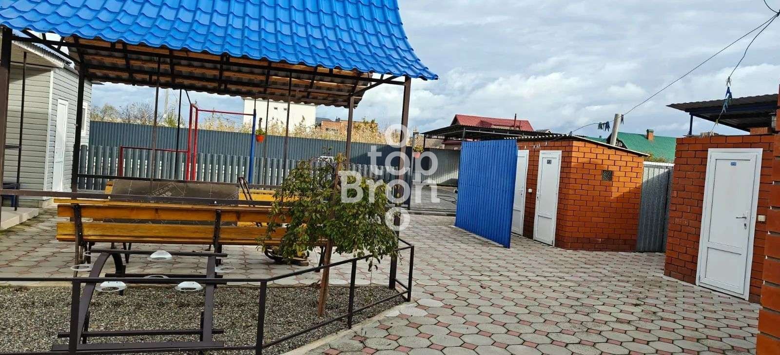 Внутренний двор вымощен плиткой, перед домиками много зелени и цветов. Есть бассейн 5*10 с детским отделением. Для детей оборудована детская площадка. Автостоянка организована перед двором. Всем постояльцам предоставляется доступ к Wi-Fi.