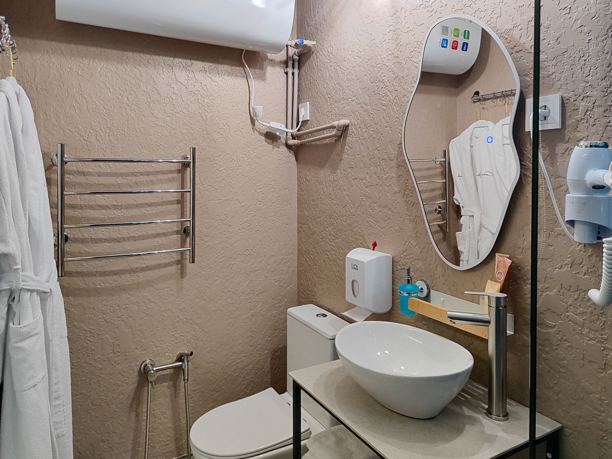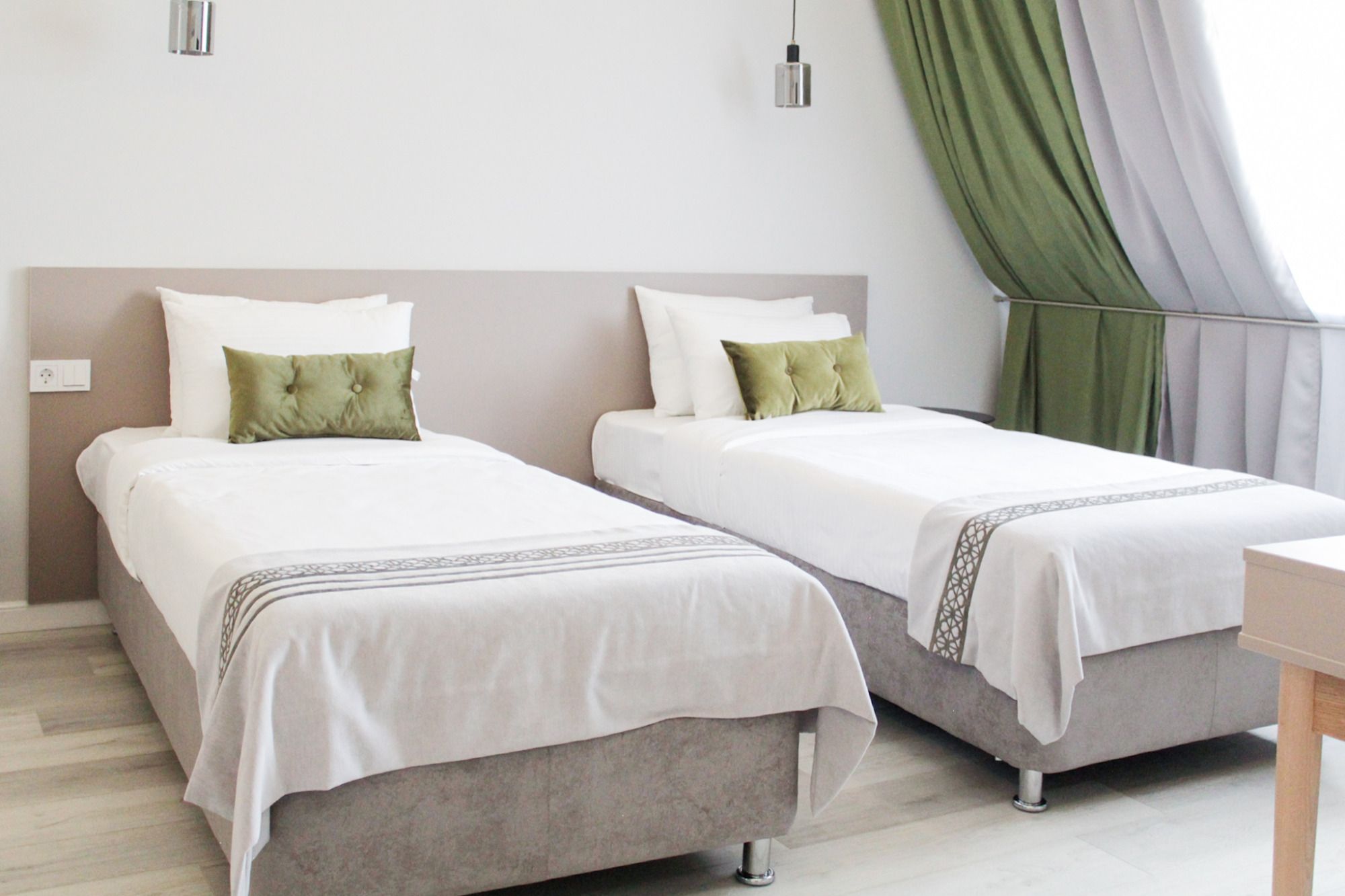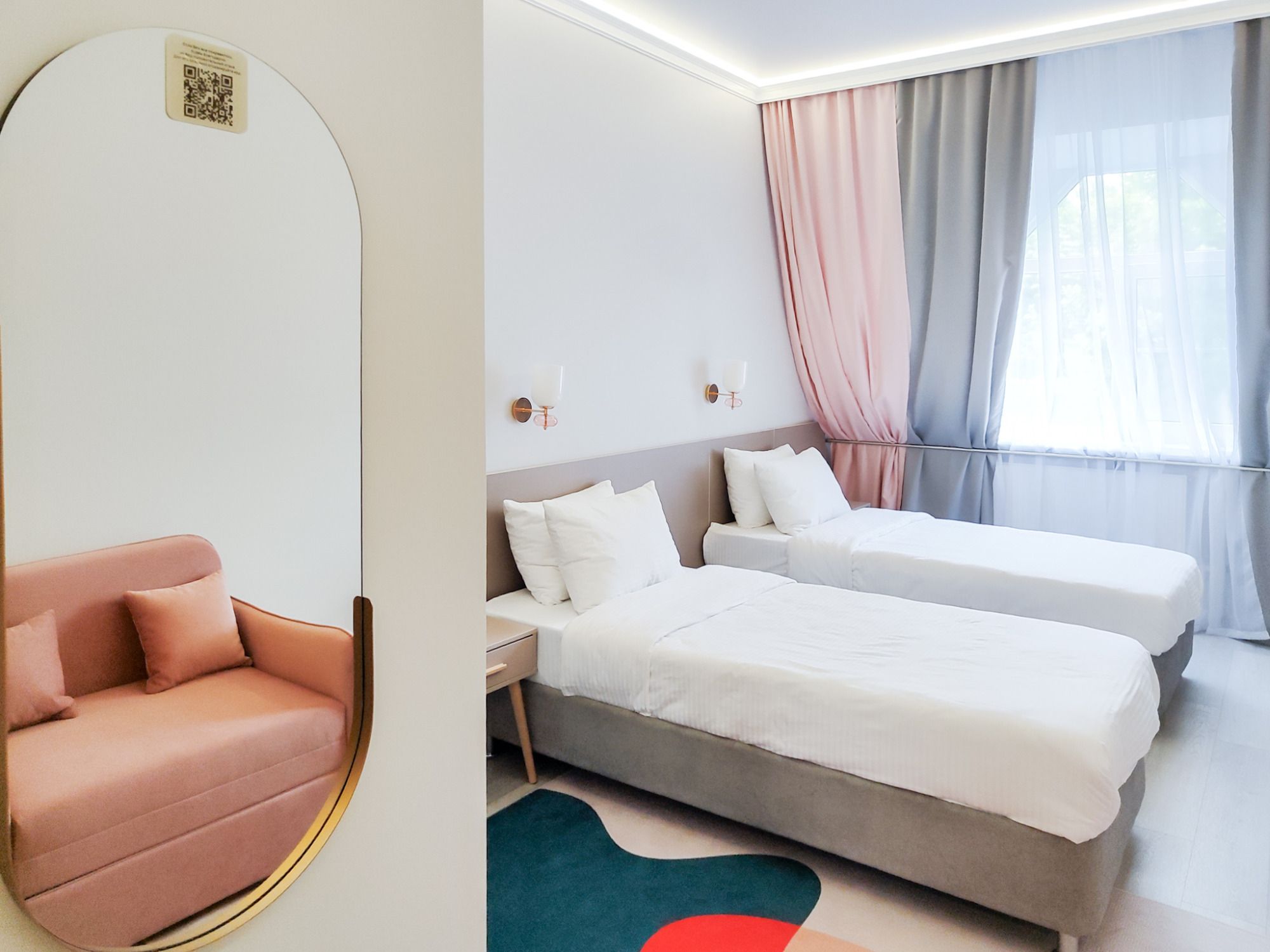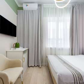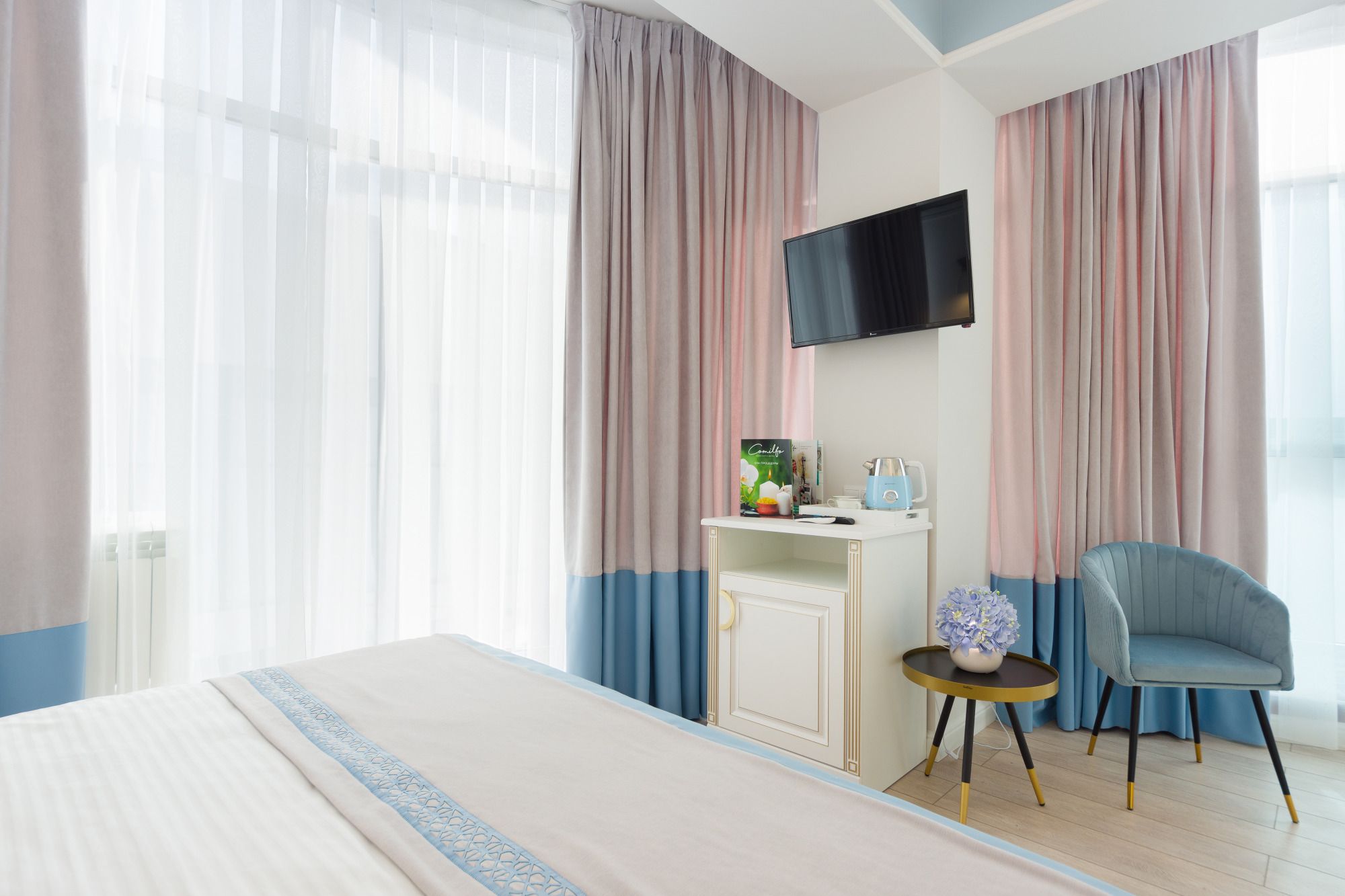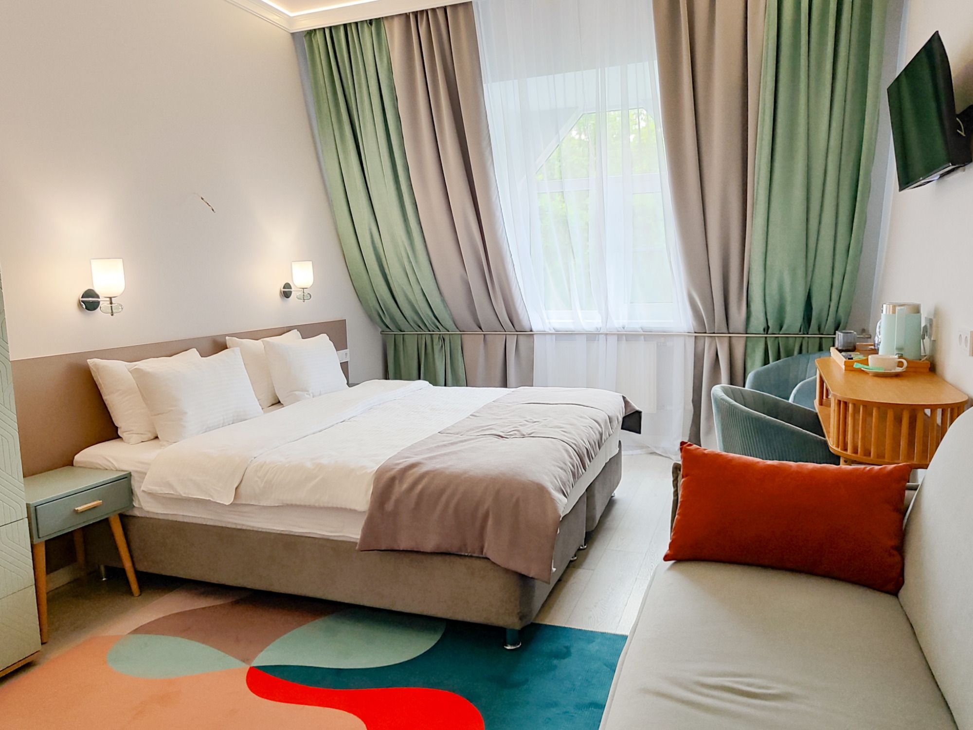 Для гостей подготовлены комфортные номера с удобной мебелью, централизованной системой кондиционирования воздуха, сейфом, мини-холодильником, телевизором, электрочайником и прочим необходимым оборудованием. Ванные комнаты оснащены полотенцами, халатами, тапочками, косметикой, имеется гигиенический душ. Уборка номера ежедневно, смена полотенец раз в 2 дня или по запросу, смена постельного белья раз в три дня или по запросу.