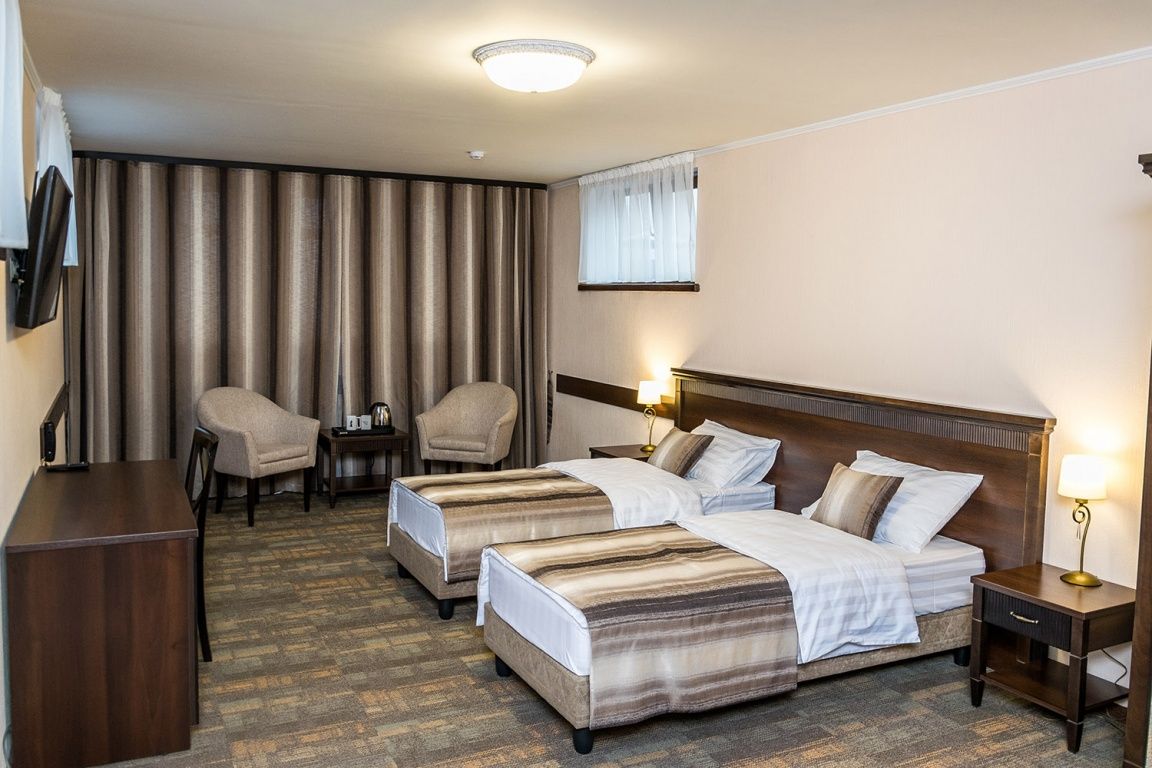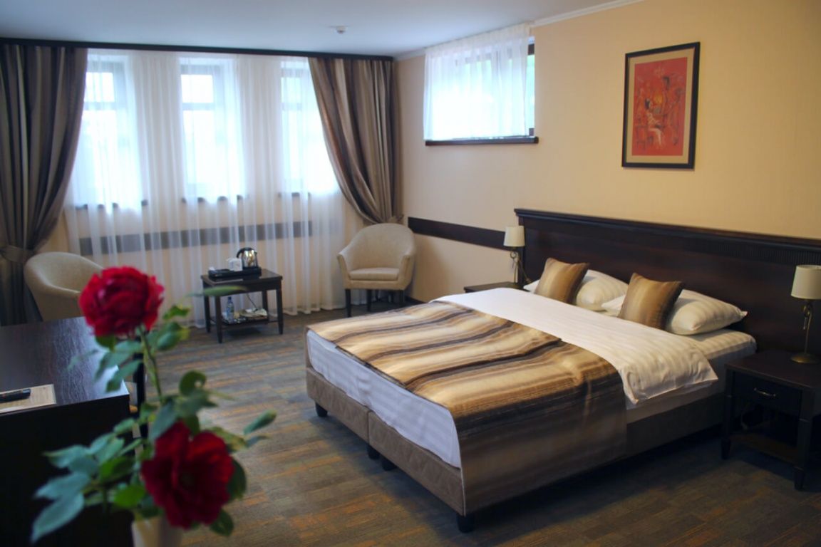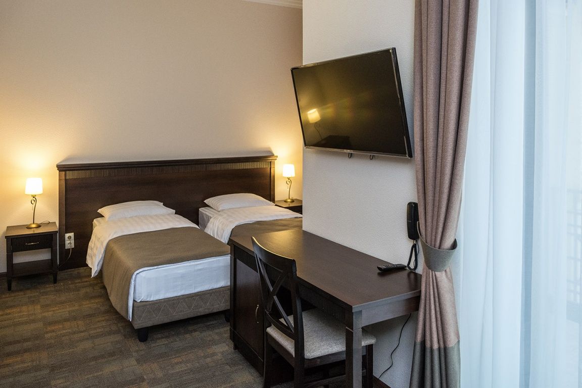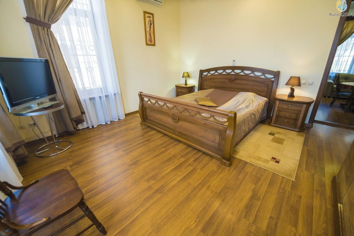 "Герой нашего времени", стены украшены авторскими работами известных местных художников. Для гостей доступны просторные 1-но и 2-х местные однокомнатные номера повышенной комфортности, 2-х комнатный люкс, 3-х комнатные апартаменты. Все номера оснащены новой мебелью, TV с функцией «Смарт», телефонами,