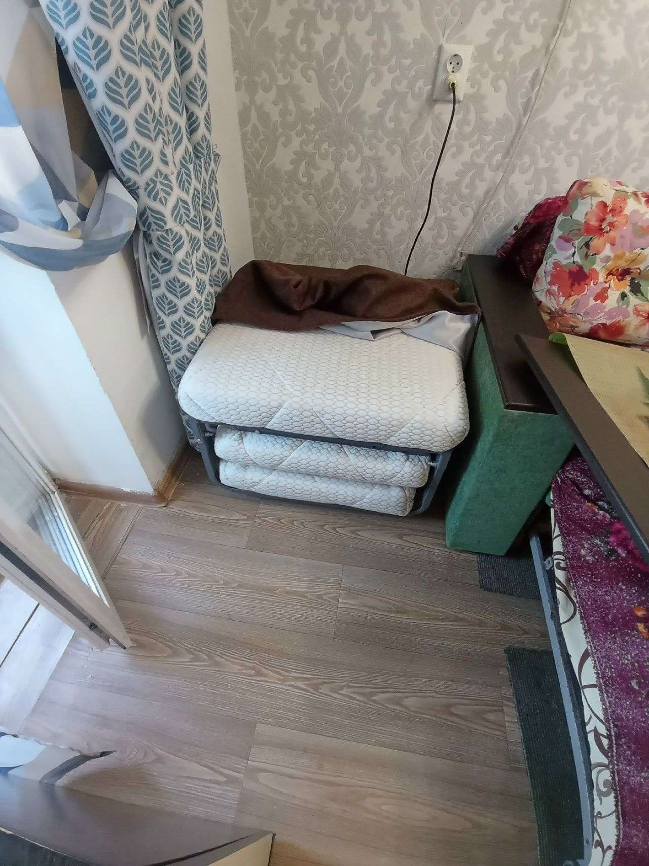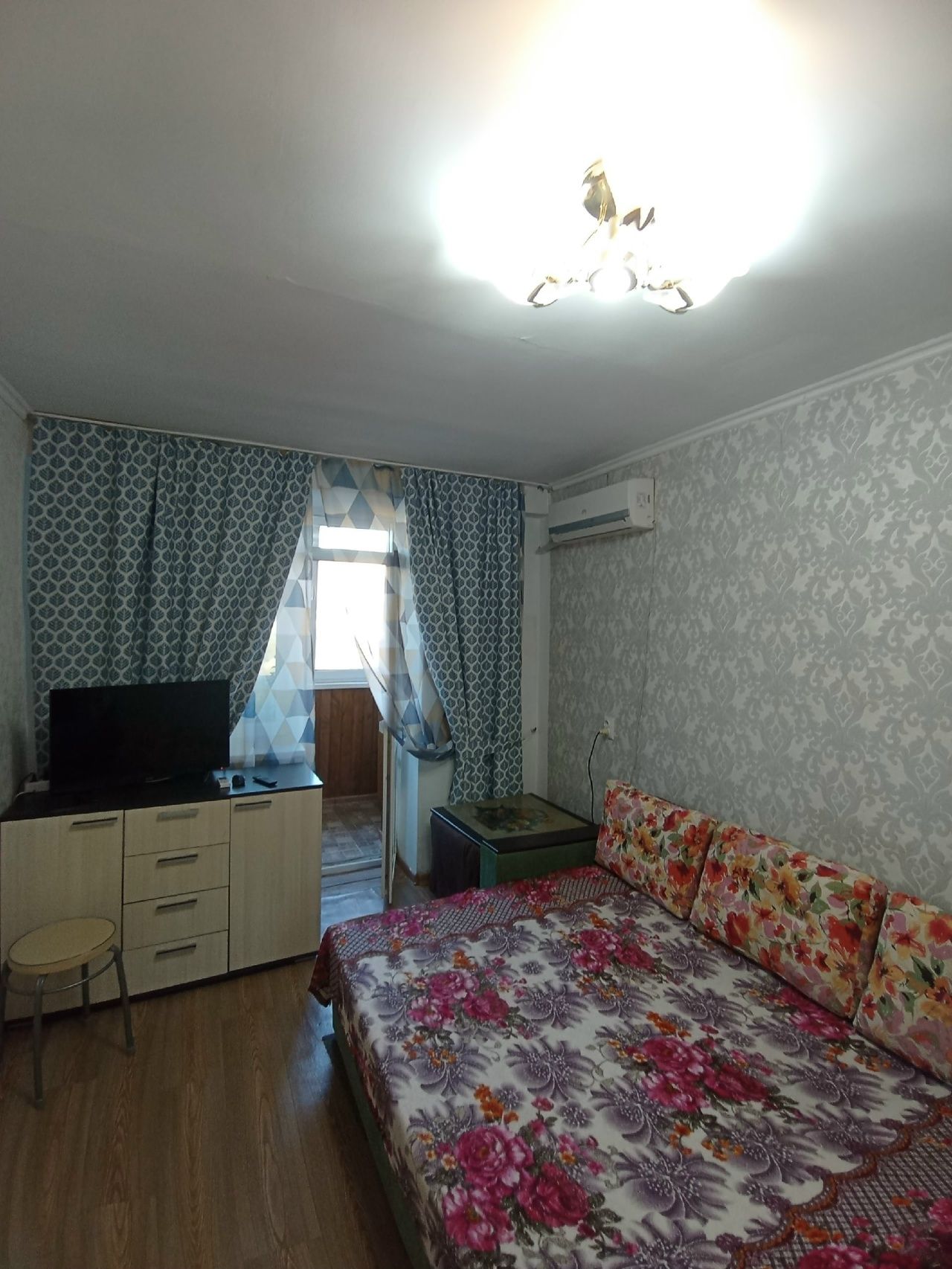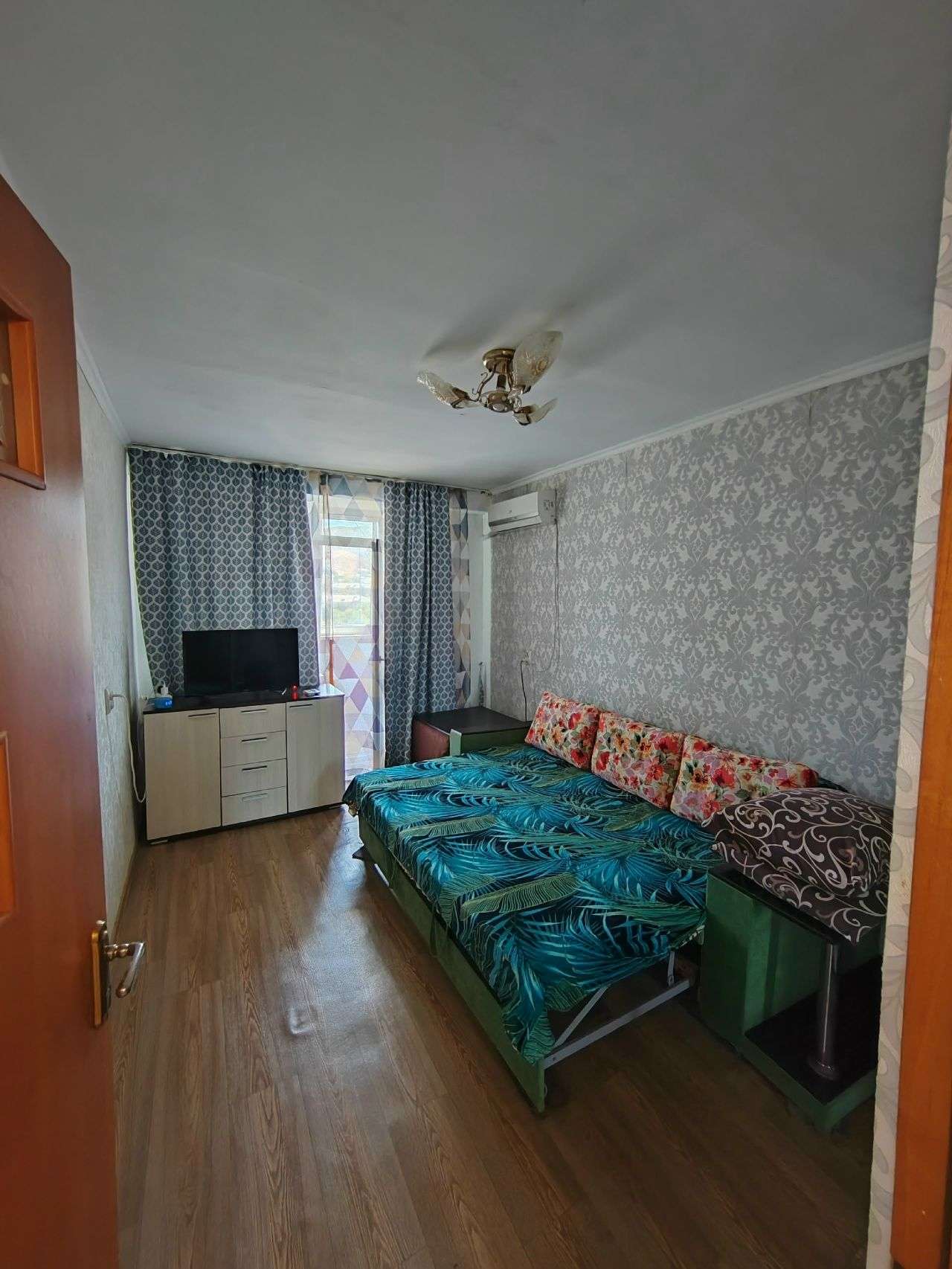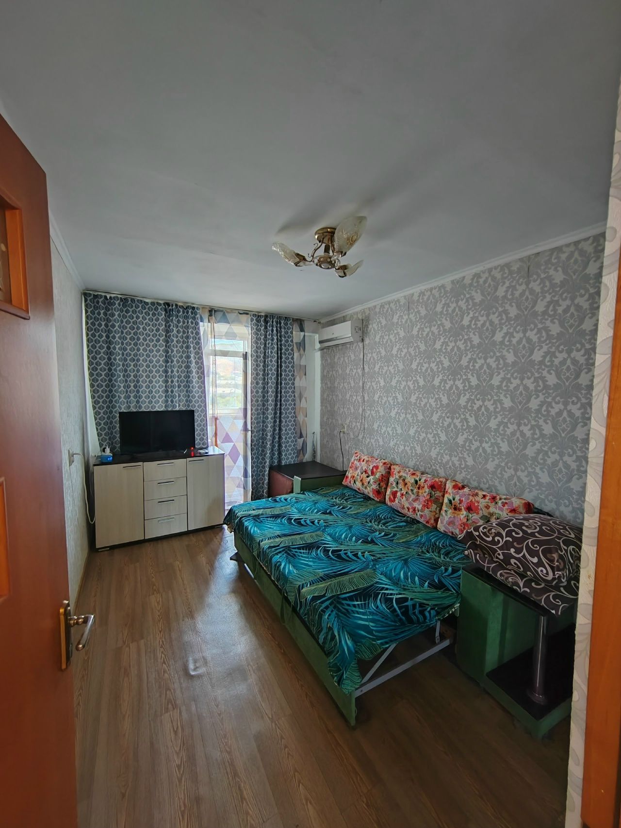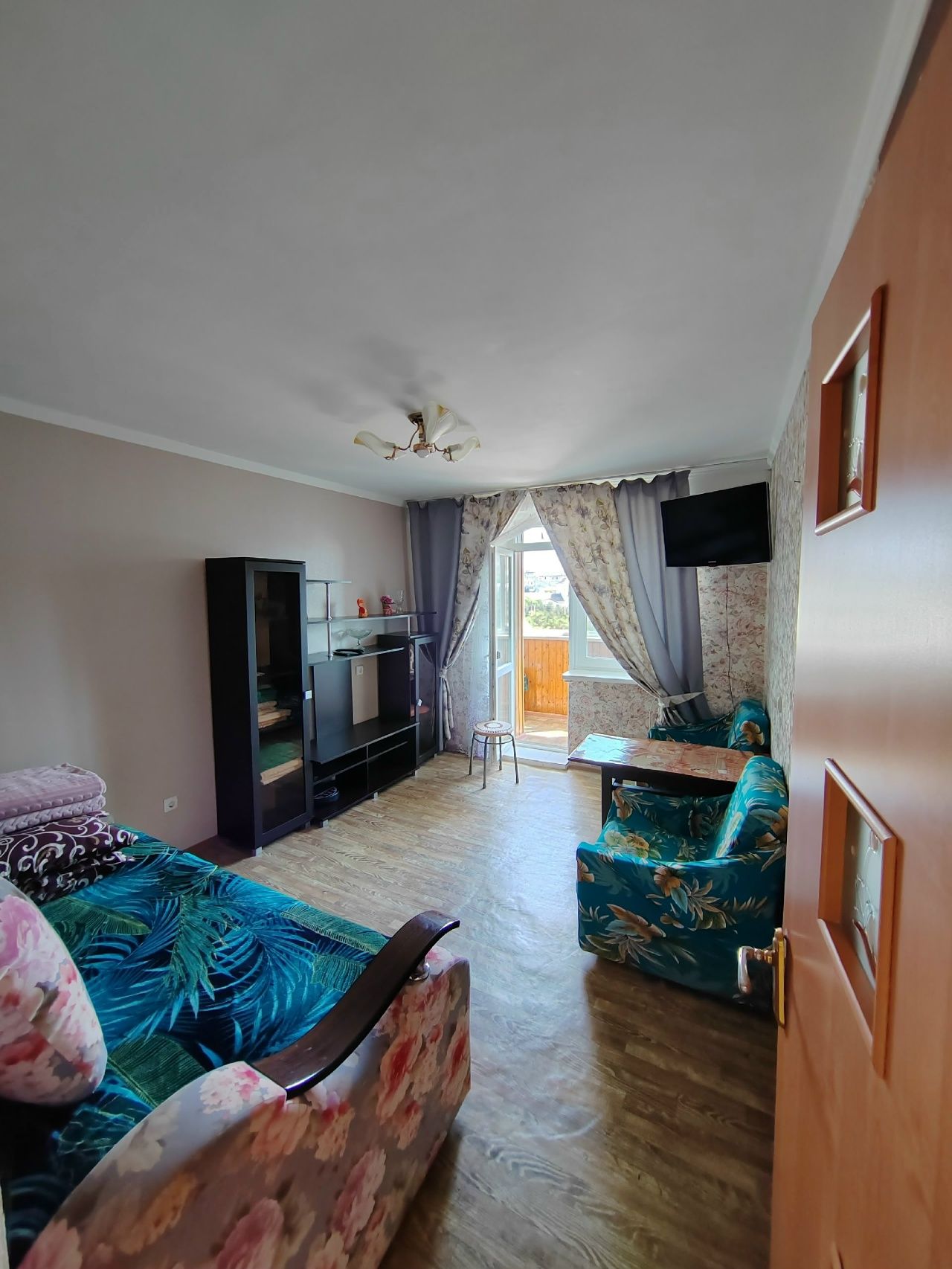 В квартире две раздельные комнаты, есть два телевизора, два дивана, один кондиционер в правой комнате, одна евро раскладушка, есть вай-фай. Балкон с боковым видом на море, на балкон выход из