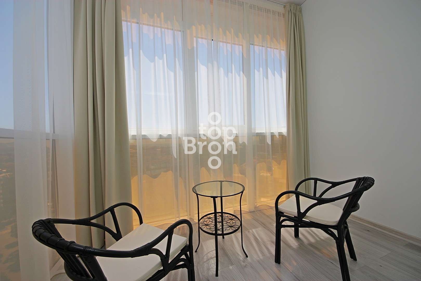 В квартирах: двуспальные кровати (ширина 160 см), диван-кровати, сплит-система, телевизоры, интерактивное ТВ (128 каналов), интернет Wi-Fi, электропанель, холодильник, СВЧ, эл. чайник, необходимый набор посуды, санузел с ванной и душем, стиральная машина, фен, утюг, гладильная доска, сушилка для белья. Квартиры рассчитаны на проживание до 4-х и до 6-ти человек. Из окон открываются фантастические виды на море и город.
