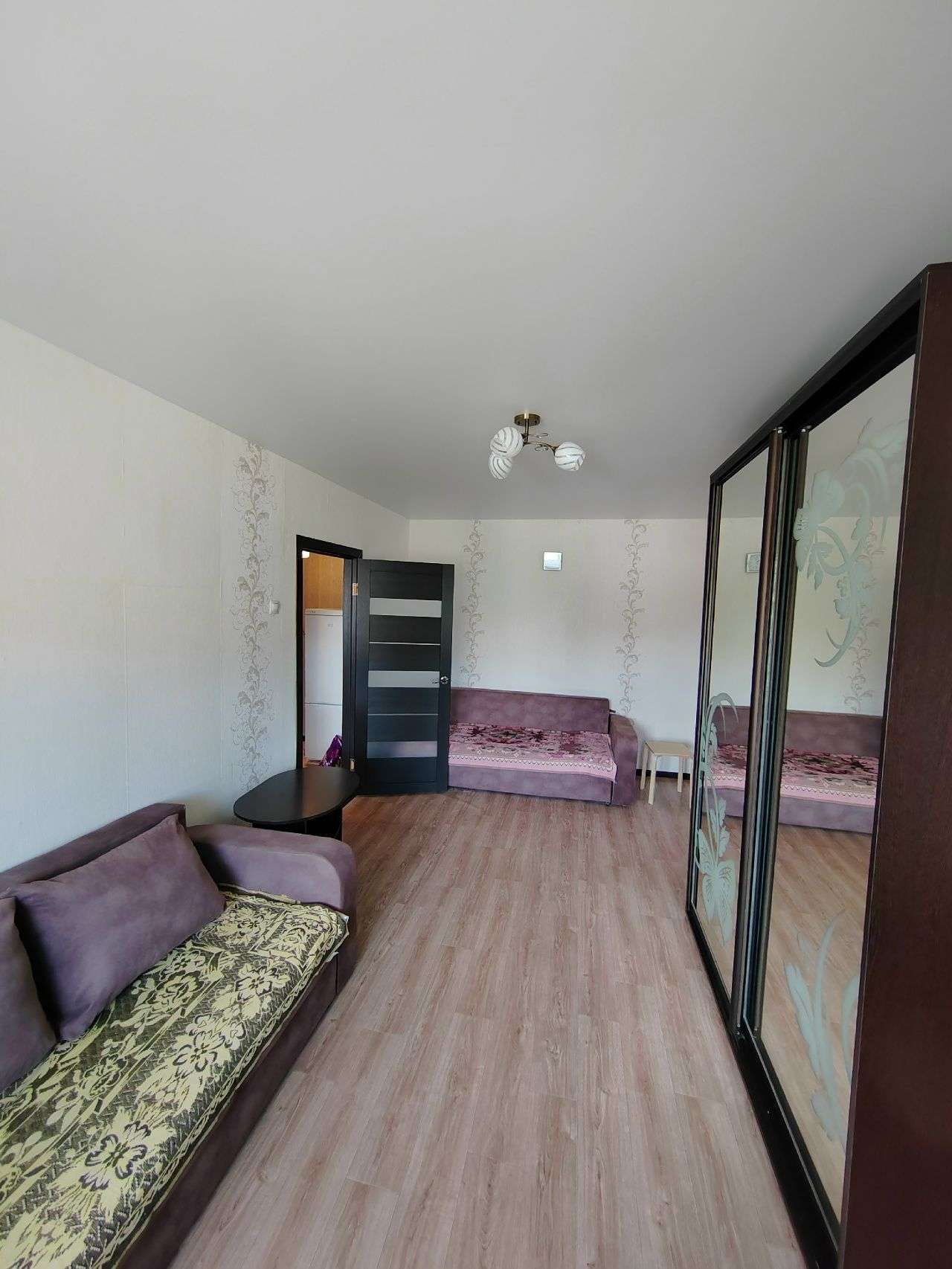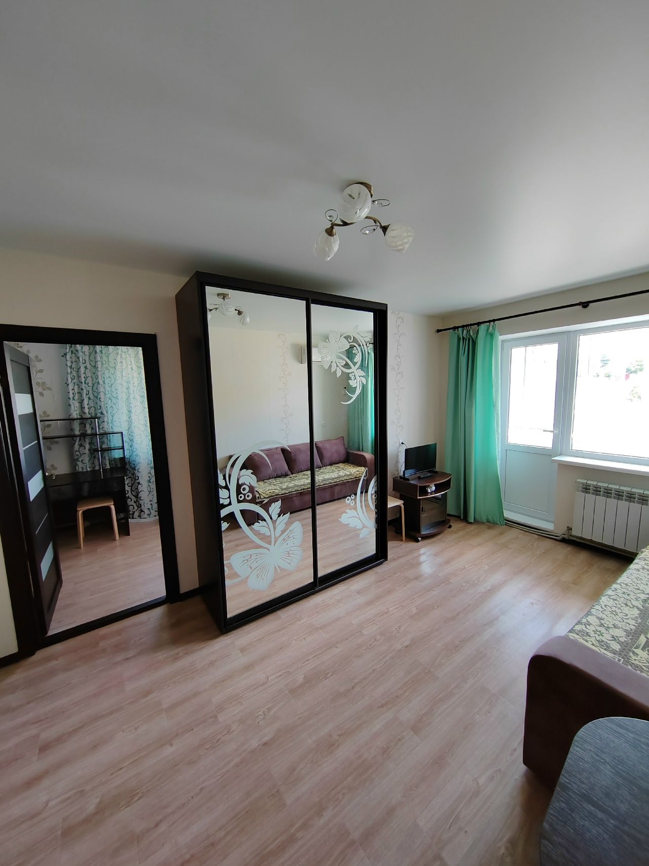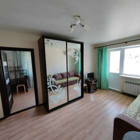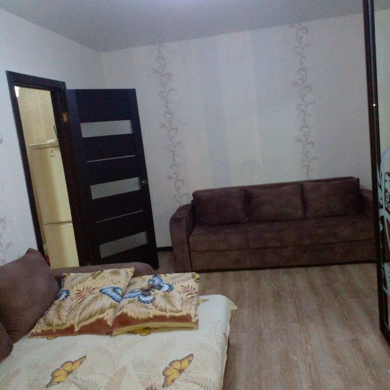Квартира расположена на 4 этаже. Все удобства. В первой комнате: два дивана, шкаф, кондиционер, телевизор и балкон. В дальней комнате кровать двуспальная и две тумбы. На кухне стиральная машина, высокий холодильник, микроволновка, чайник, посуда, есть утюг.
