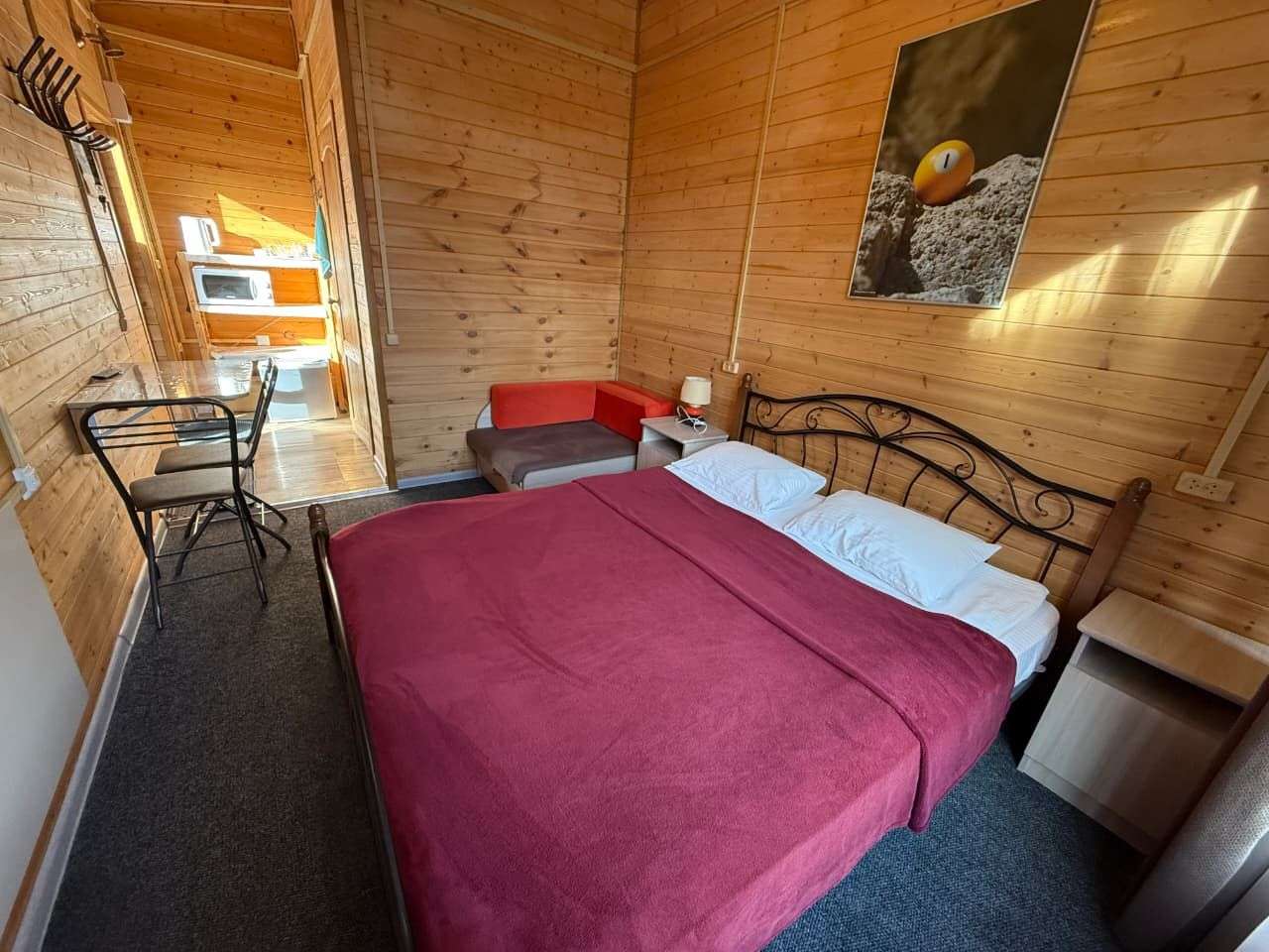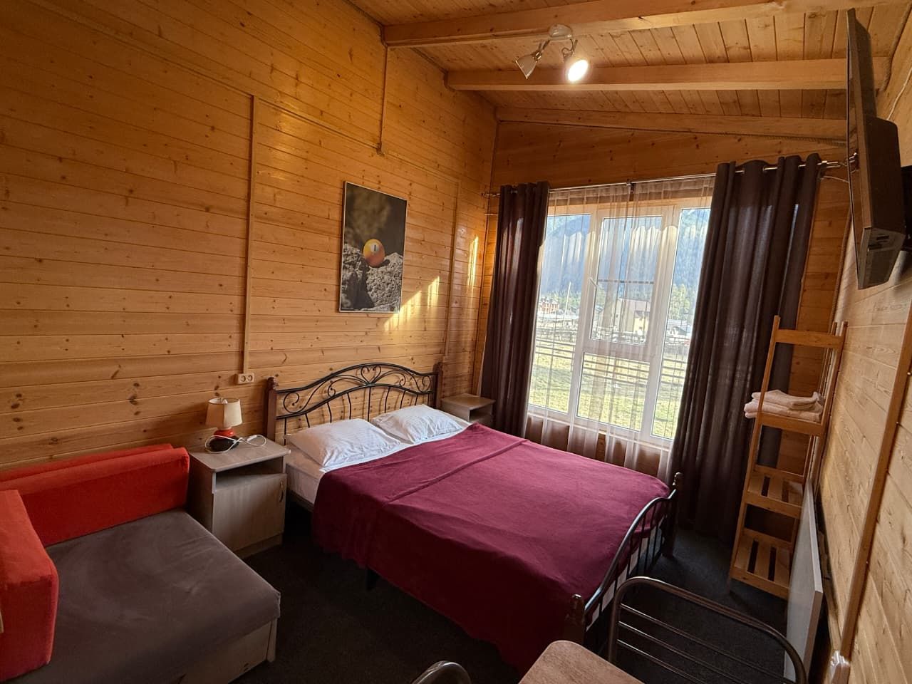 Для проживания предлагаются 2х местные номера с видом на горы. В каждом из них есть все необходимое для комфортного отдыха: двуспальная кровать, телевизор, эл.чайник, душ, туалет. Ковровое покрытие в спальной